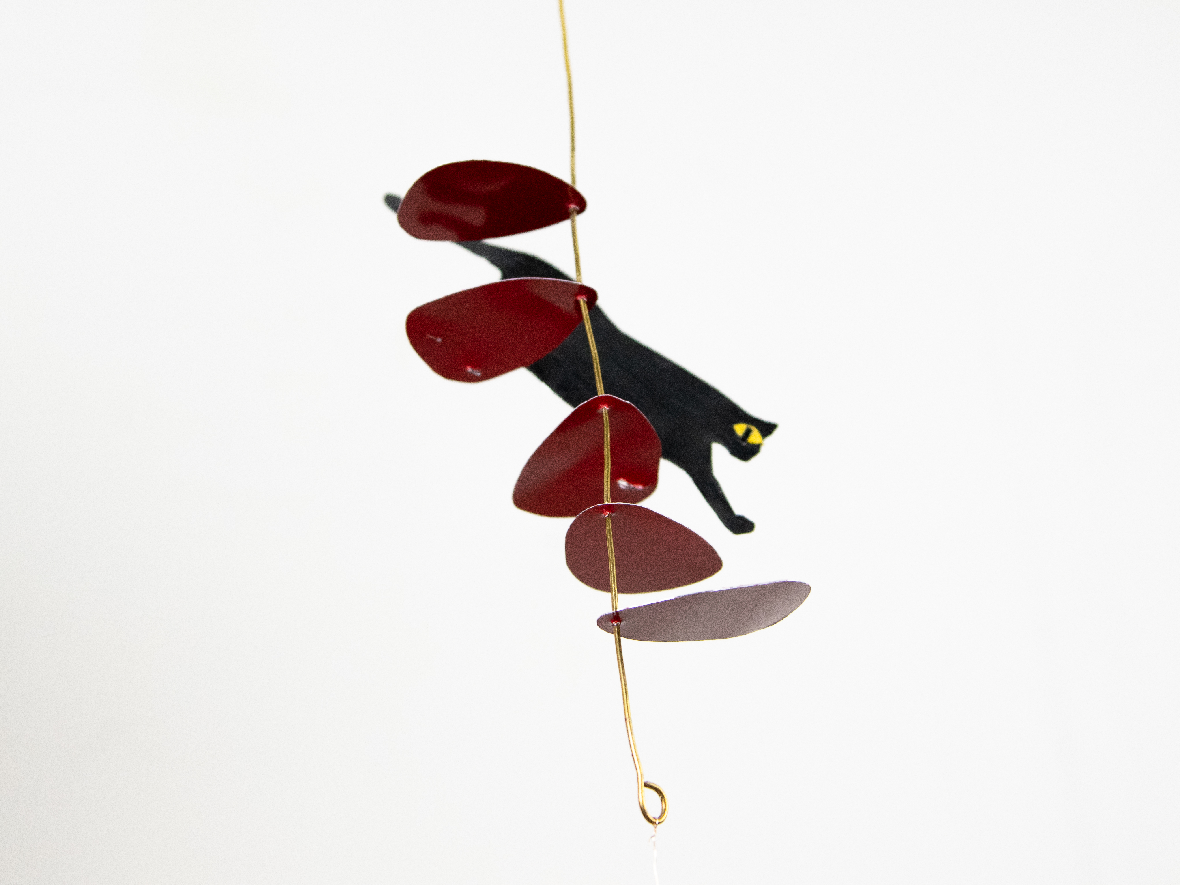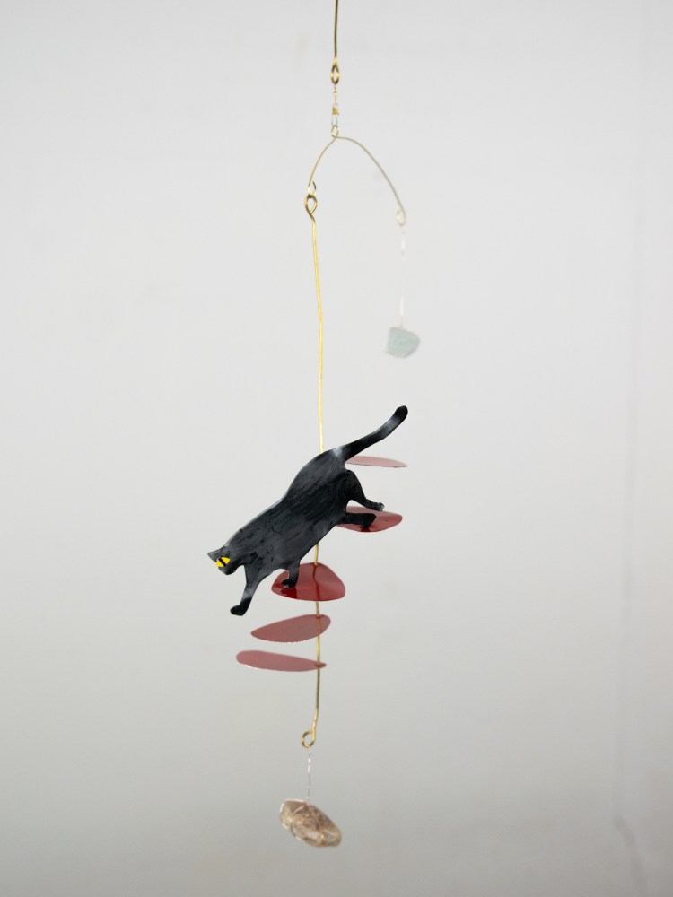 Embrace the enigmatic allure with this hanging mobile, featuring a mysterious black one-eyed cat gracefully descending on some hypnotic spiral steps. Suspended in mid-air, this mobile captures the essence of curiosity and charm, as the feline navigates the spiraling pathway with an air of playful mystique.