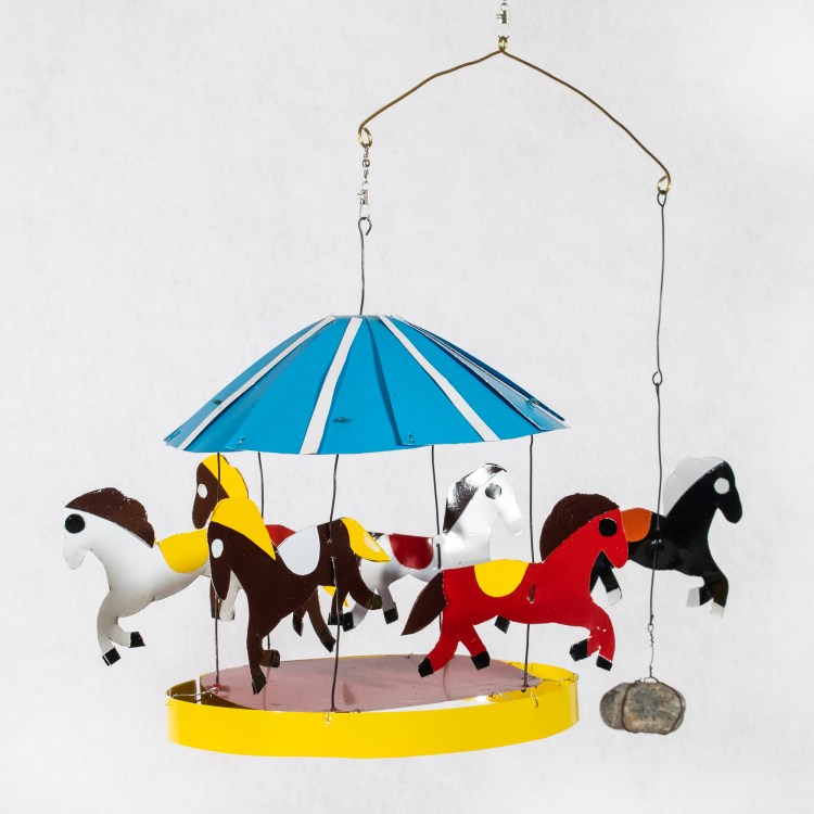 Step into a whimsical world of wonder with amusement with this hanging mobile! At first glance, it’s a classic merry-go-round, horses captured in mid-gallop, but upon closer inspection, you’ll notice something extraordinary – one of the horses has escaped! Hang this mobile and let the spirited energy of the escaping carousel horse infuse your space with a sense of whimsy and adventure..
